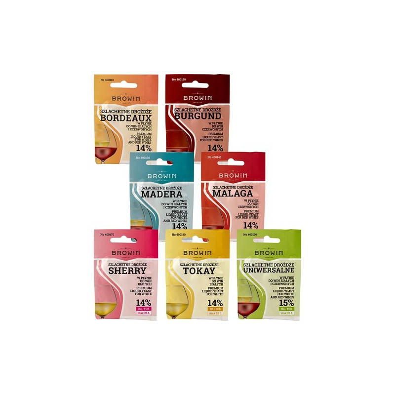 Szlachetne, płynne drożdże winiarskie - w opakowaniu zbiorczym: 50 sztuk. Specjalnie wyselekcjonowane szczepy drożdży w opakowaniu (w różnych proporcjach): - Bordeaux - Burgund - Madera - Malaga - Sherry - Tokay - Uniwersalne Ten zestaw drożdży pozwoli na zrobienie każdego rodzaju wina. Polecany jest m.in. do win z agrestu, gruszek, moreli, truskawek, zbóż, głogu, jabłek, dzikiej róży, białych i czarnych winogron, rabarbaru, rodzynek, czereśni, wiśni, malin, śliwek renklod i węgierek, aronii, jeżyn, czarnych, białych i czerwonych porzeczek, czarnych jagód, czarnego bzu. Pakiet specjalnie wyselekcjonowanych szczepów drożdży winiarskich zawieszonych w płynie ochronnym. Drożdże te zapewniają stabilną fermentację, dobre odfermentowanie cukrów, trwałą barwę wina i atrakcyjny bukiet.