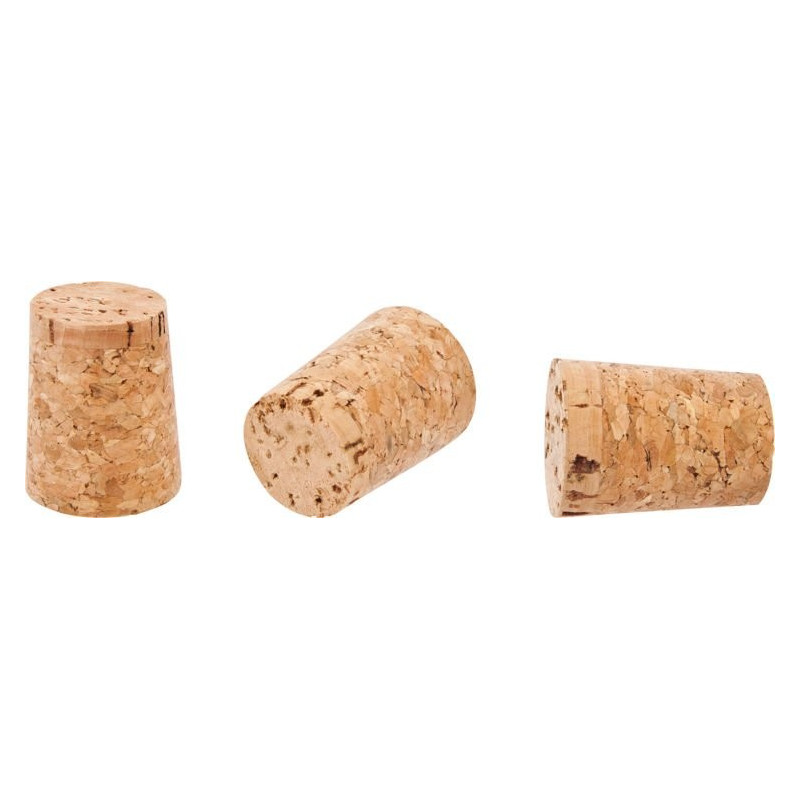 Korek z korka, stożkowy dopasowany do butelek o średnicy wewnętrznej szyjki ok 19-21 mm.