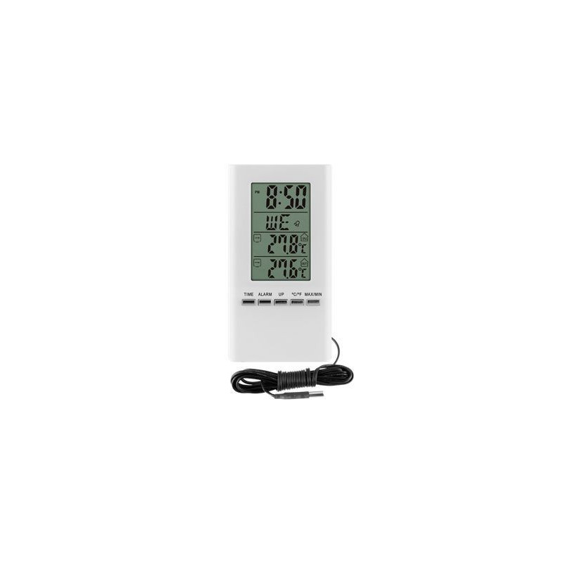 Elektroniczny termometr z wbudowanym zegarem, który można zawiesić lub postawić w dowolnym miejscu.