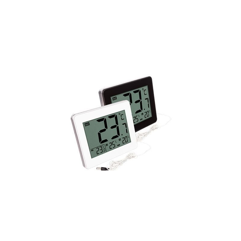 Elektroniczny termometr z zegarem, posiadający m. in. funkcję ostrzegania przed gołoledzią i zmianą tendencji temperatury.