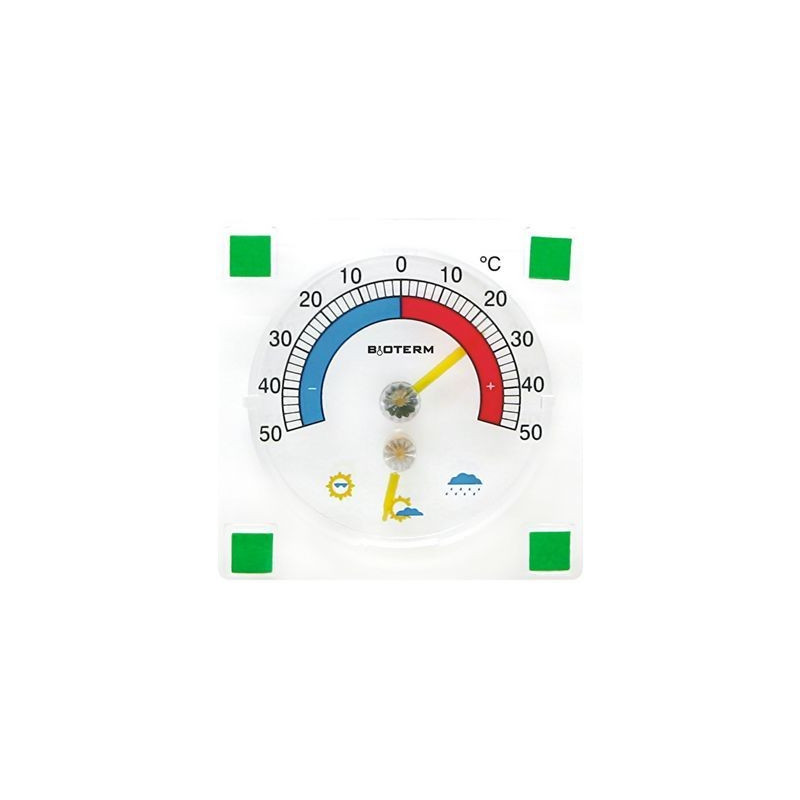 Termometr bimetaliczny kwadratowy, wykonany z przezroczystego tworzywa. Skala nadrukowana jest bezpośrednio na plastiku. Odczytu temperatury można dokonać zarówno w stopniach Celsjusza (zewnętrzna skala), jak i stopniach Fahrenheita (skala wewnętrzna).