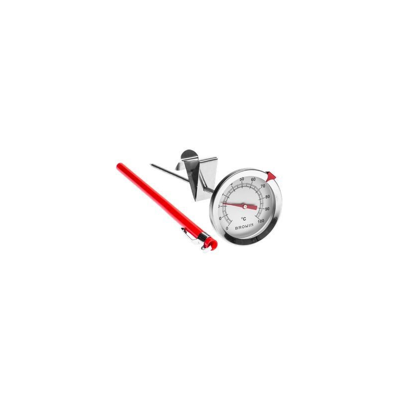 Produkt wykonany z bardzo dobrej jakości stali nierdzewnej i szkła odpornego na wysoką temperaturę. Dodatkowo, w zestawie znajduje się klips do mocowania termometru na garnku, specjalna osłona sondy i wskaźnik na tarczy służący do precyzyjnego wyznaczania pożądanej temperatury.